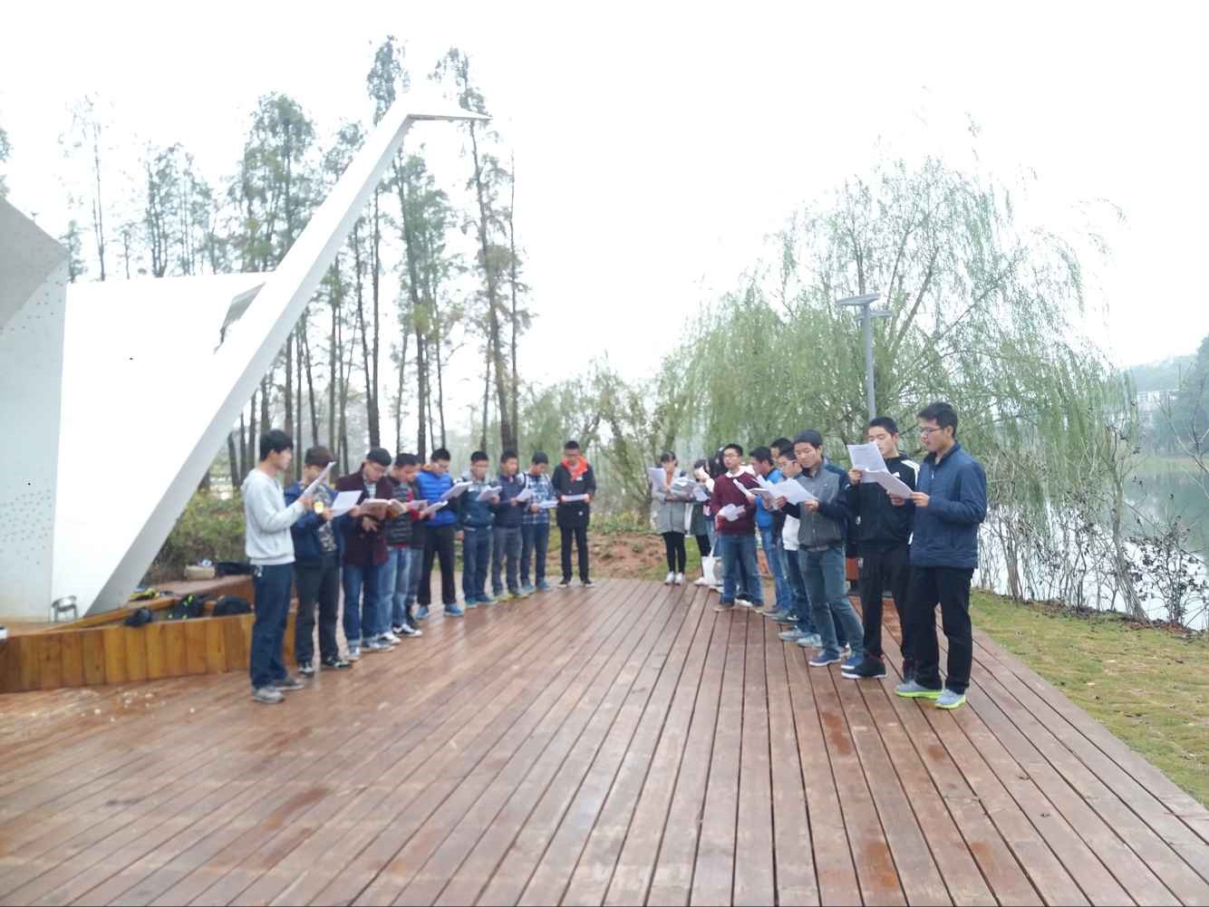 七点整,蒙蒙细雨,并未浇灭同学们对英语学习的热情,大家都准时来到公园进行晨读。同学们在拿到学习部部长魏冰冰精心准备的材料后,便在他的带领下,一起整齐、大声地朗读了起来。在朗读过程中,同学们都非常认真,发声铿锵有力,并相互之间一句一字地纠正着彼此的发音。整个广场上朗诵声此起彼伏,充绕着浓浓的学习氛围。在几轮朗诵过后,同学们还按照负责人要求纷纷进行了小组合作,3个人一组,采取单词接龙和英语造句的方式,再次对阅读内容进行了记忆。魏冰冰强调只有大胆地模仿、大声地朗读、勤奋地背诵,口语能力才能得到真正的提升。最后,同学们大声齐读了材料内容,完美地结束了此次英语晨读活动。