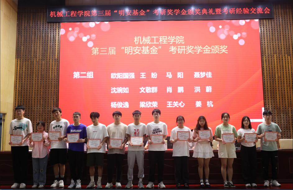 6月7日下午,机械工程学院在图书馆第一报告厅举行第三届“明安基金”考研奖学金发放仪式暨考研经验交流会。校党委委员、副校长魏克湘,院长陈国强,党委书记覃波,副院长程玉兰,副院长邹鸿翔,全体获奖学生以及21级学生参加活动,党委副书记李欣主持仪式。