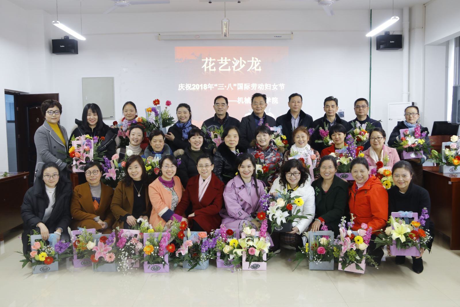 为庆祝2018年“三·八”国际劳动妇女节的到来,机械工程学院于3月8日下午在机械楼312室举行花艺沙龙活动,活动由工会副主席范冬英主持,学院领导班子以及全体女教职工参加。
