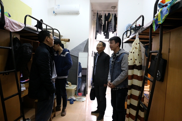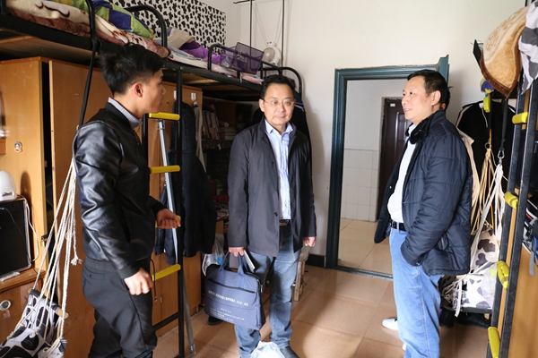 3月13日下午,为了解新学期学生到校情况,17级学生寝室搬迁情况,机械工程学院院长魏克湘、党总支书记谢骐、副院长卿上乐、副书记李儒峰深入学生宿舍,看望返校学生。
