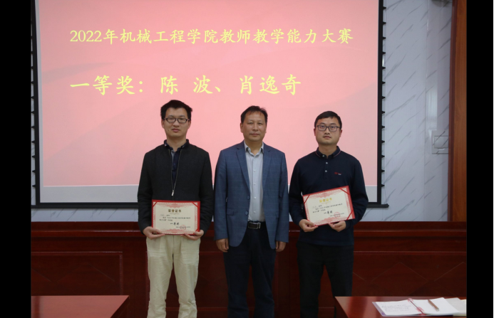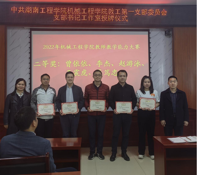 魏克湘为支部书记工作室授牌。授牌仪式结束后,魏克湘和学院领导为陈波、肖逸奇等14名获得2022年机械工程学院教师教学能力大赛一、二、三等奖的老师们颁奖。
