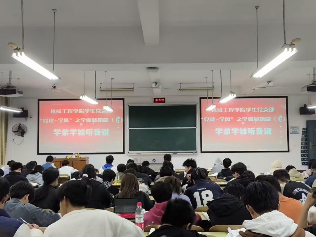 近日,机械工程学院举办了以“党建+学风”——“学弟学妹听我说”为主题的学习经验分享会。本次活动由机械工程学院学生党支部联合“油滴”朋辈辅导团队共同策划,旨在通过分享优秀机械学子的宝贵学习经验,引导大一新生更好的规划大学生活。