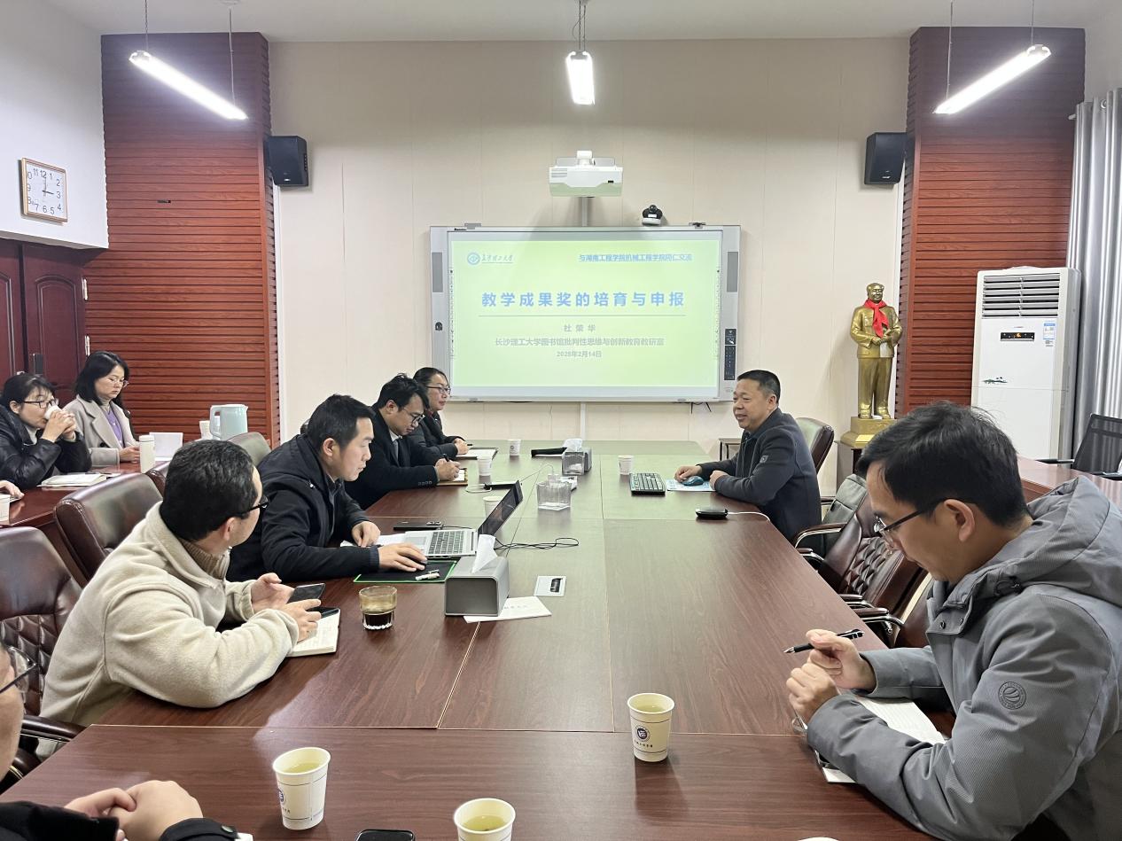 为进一步推动2025年教学成果奖申报的准备工作,机械工程学院于2月14日邀请了长沙理工大学图书馆馆长杜荣华教授来院专题指导。校党委委员、副校长魏克湘,全体院领导及部分教师参加了指导会。