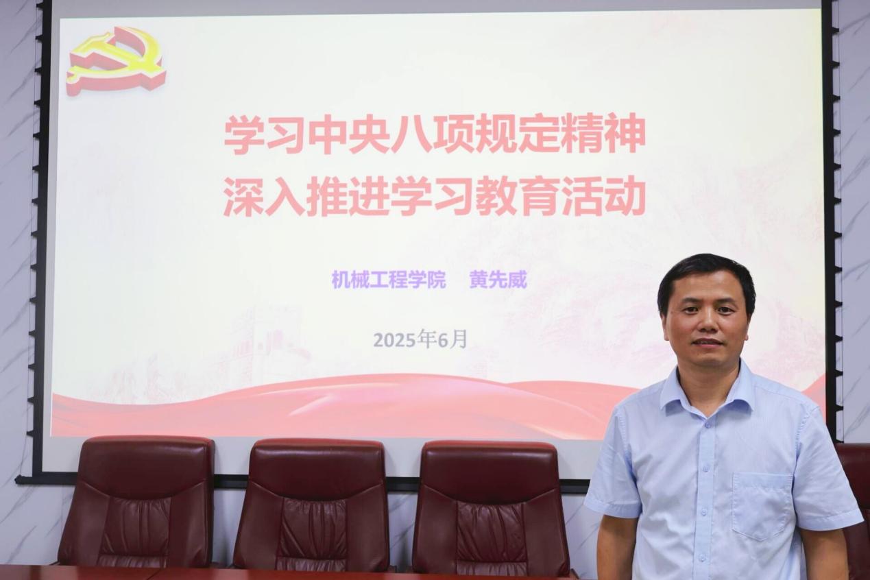 为深入学习贯彻中央八项规定精神,扎实推进作风建设,6月24日下午,机械工程学院党委书记黄先威在机械楼312会议室为全院教职工党员讲授专题党课。