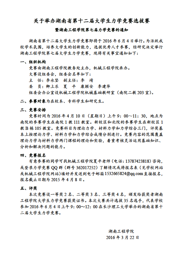 关于举办湖南省第十二届大学生力学竞赛选拔赛暨湖南工程学院第七届力学竞赛的通知
