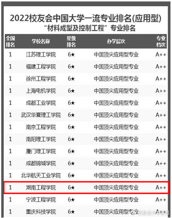 湖南工程学院材料成型及控制工程专业起源于原湘潭机电高专于1992年开办的模具设计与制造专业,2000年升为本科,2006年获评校级重点专业,2011年获批为教育部“卓越工程师培养计划”改革专业,2020年获批为“卓越计划2.0“改革专业,2021年获批为湖南省一流本科专业建设点,在艾瑞深2022年校友会中国大学一流专业排名(应用型)评为6A++中国顶尖应用型专业,排全国第一档。经过30年的办学积淀,本专业形成了鲜明的办学特色与优势: