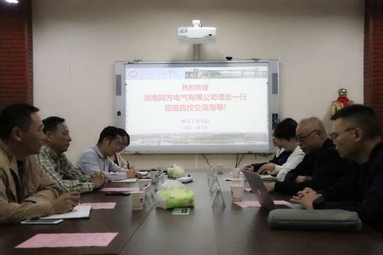 10月20日上午,湖南同方电气有限公司董事长谭少文一行来我校洽谈校企合作相关事宜。学校党委委员、副校长魏克湘出席并致辞,机械工程学院、电气与信息工程学院相关负责人参加。会议由机械工程学院院长陈国强主持。